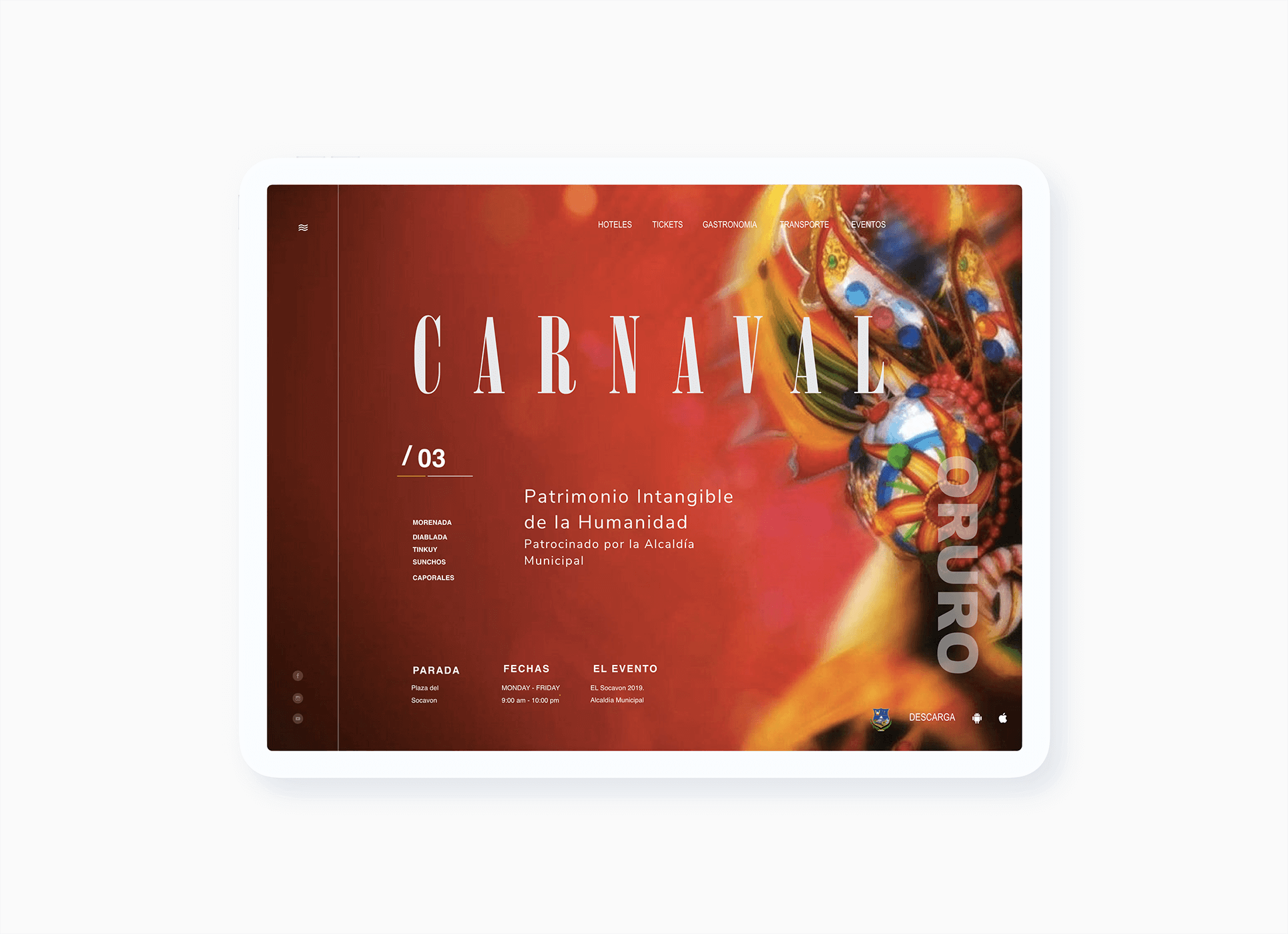 I was responsible for the experience strategy and design of the iOS/Android apps. I lead the UX work, producing all deliverables and presenting these to the client 2 months prior to the start of the carnival. I worked alongside a local UX Architect who focused on the technology stack. User Research and Market Analysis, Information architecture, prototyping, UI design Content strategy, Design System, Style Guide creation, and Art Direction.
